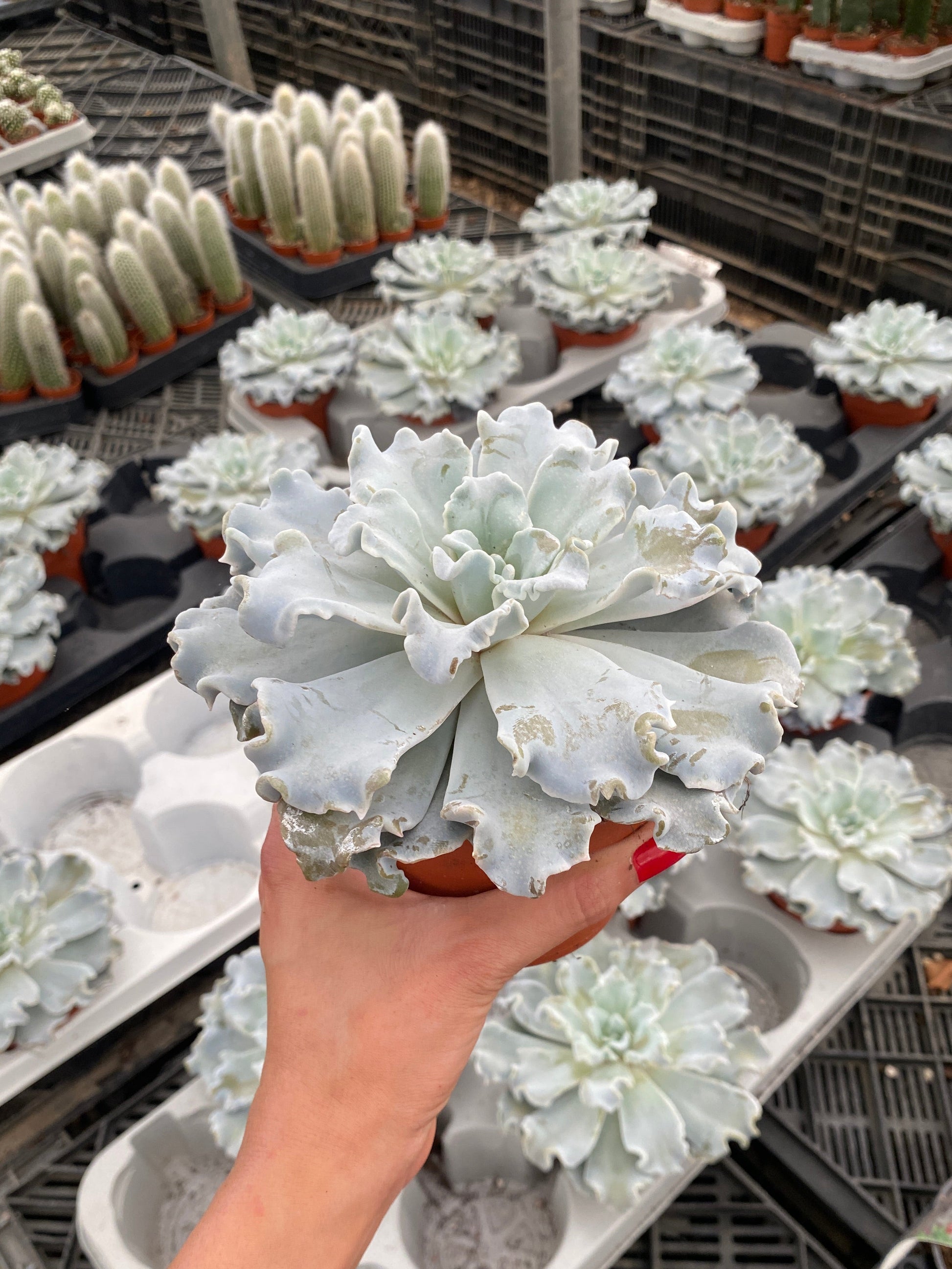 delicate but striking. she's a compact rosette with soft grey-green leaves edged in graceful aves and subtle hints of pink that glow in bright light.