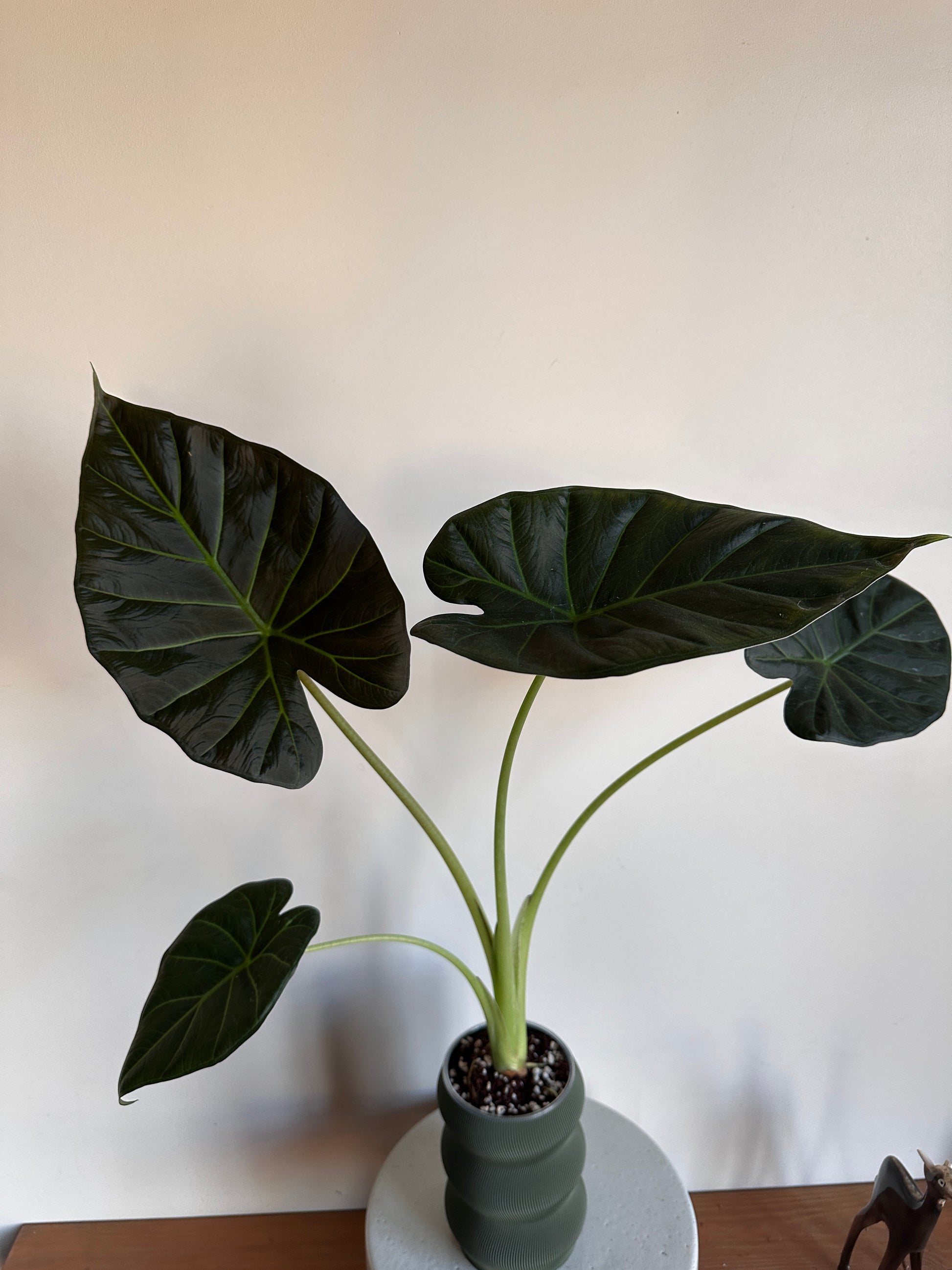 This keeps the soil consistently moist — exactly how Alocasias like it — without drowning the roots.