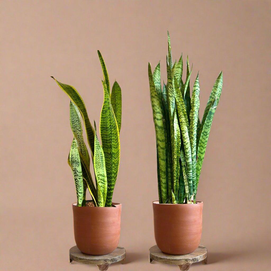Both are compact, so they fit anywhere — perfect for bedrooms, or narrow corners. And they do more than just sit pretty: snake plants release oxygen at night and help clean the air, making them some of the best plants for bedrooms.